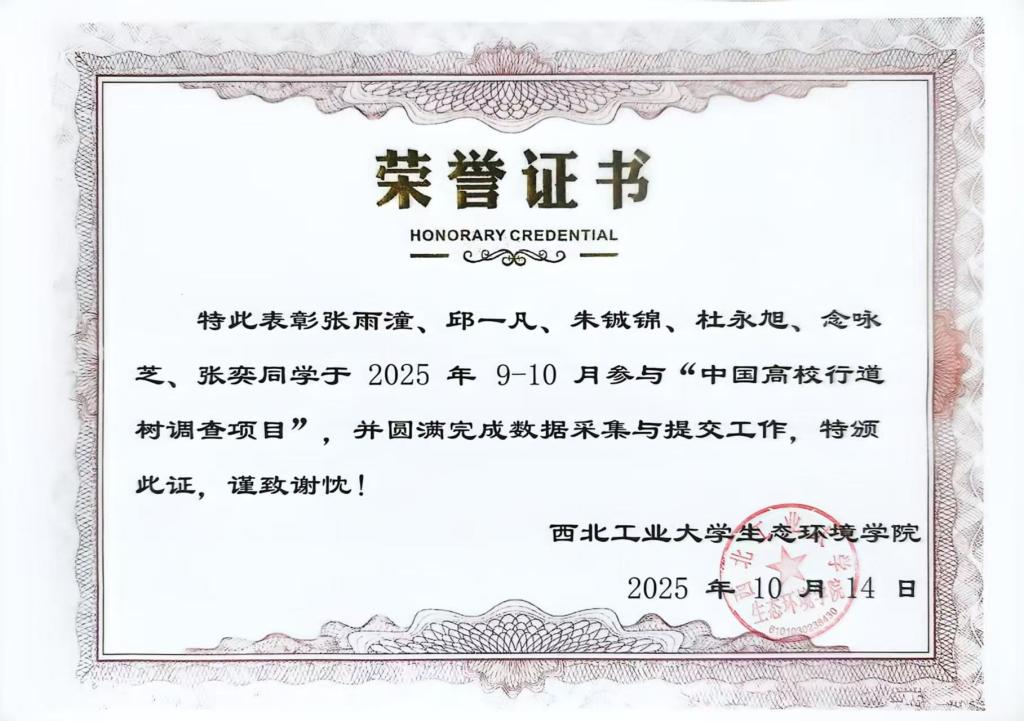近日,我院 2024 级生物科学专业张雨潼、邱一凡、朱铖锦、杜永旭、念咏芝、张奕 6 位同学,积极参与由西北工业大学生态环境学院发起的“中国高校行道树调查项目”。