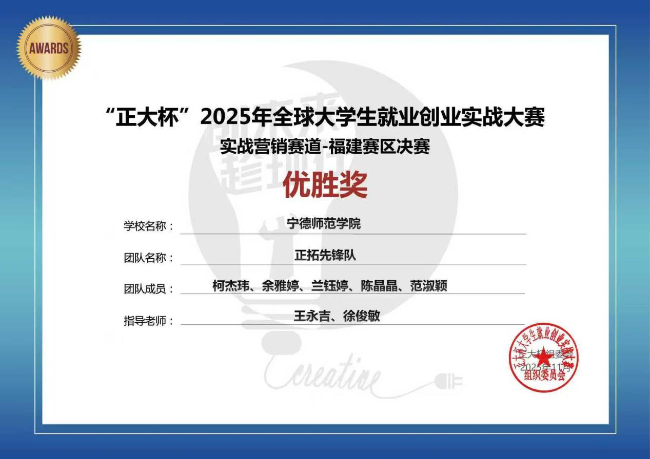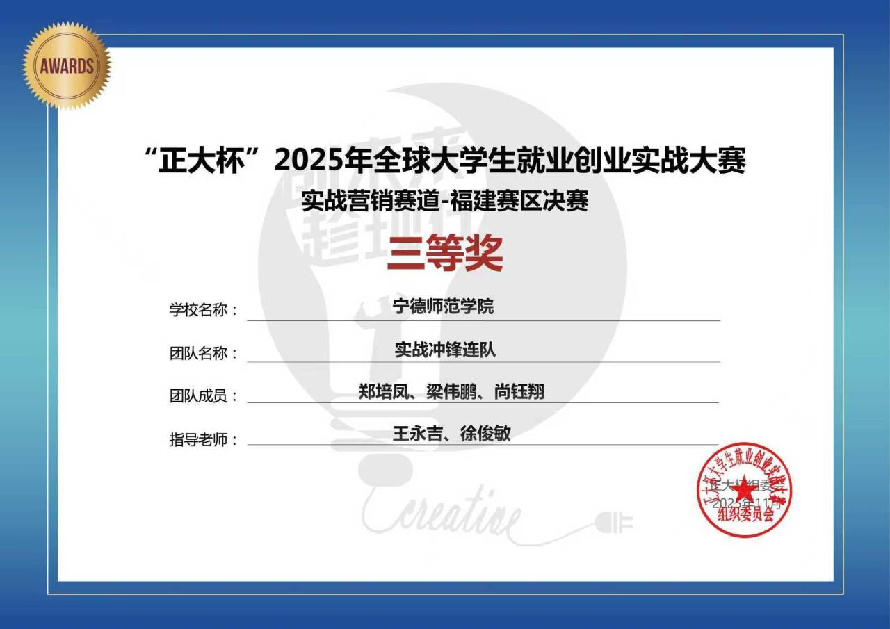 “正大杯”2025年全球大学生就业创业实战大赛实战营销赛道福建赛区决赛于近日圆满落幕。我院参赛学子在王永吉老师、徐俊敏老师的指导下,表现优异,斩获佳绩。