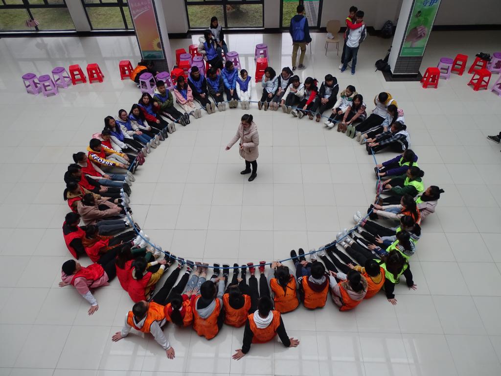 活动开始由欧嘉烟老师带领大家宣读活动誓言。经过几轮“大风吹”游戏下来,同学们彼此互相相熟,完成破冰的过程。随后同学们通过报数,分成了5个团队,各团队的成员相互认识,相互协助,并进行队名、口号、队歌的展示以及队长的选拔。随着“生日线”、“终极密码”、“人椅”、“动力圈”等游戏的推进,活动达到了高潮。活动过程中,每个团队之间的竞争力与凝聚力越来越强,各团队都有独特的优势,成员之间相互信任、相处融洽。最后,同学们主动发表自己对本次素质拓展活动的感想,为这次活动画上了圆满的句号。