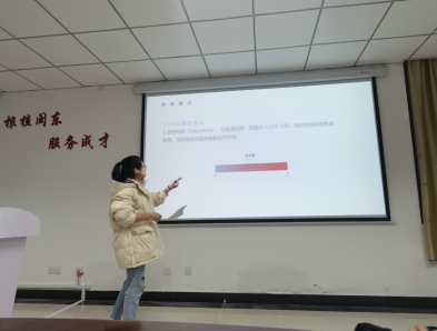 首先,林慧老师从最基础的颜色模式进行介绍,并讲解了色彩搭配理论,展示了基于色彩搭配原理设计而成的页面效果。在海报、PPT中的配色原则中,林慧老师特别强调了在同一版面设计上,色彩、字体不能超过三种,就此点,她点评了运动会简报设计,并指出了其中的不足之处,希望同学们能遵循设计原则,设计出简约、大方的作品。