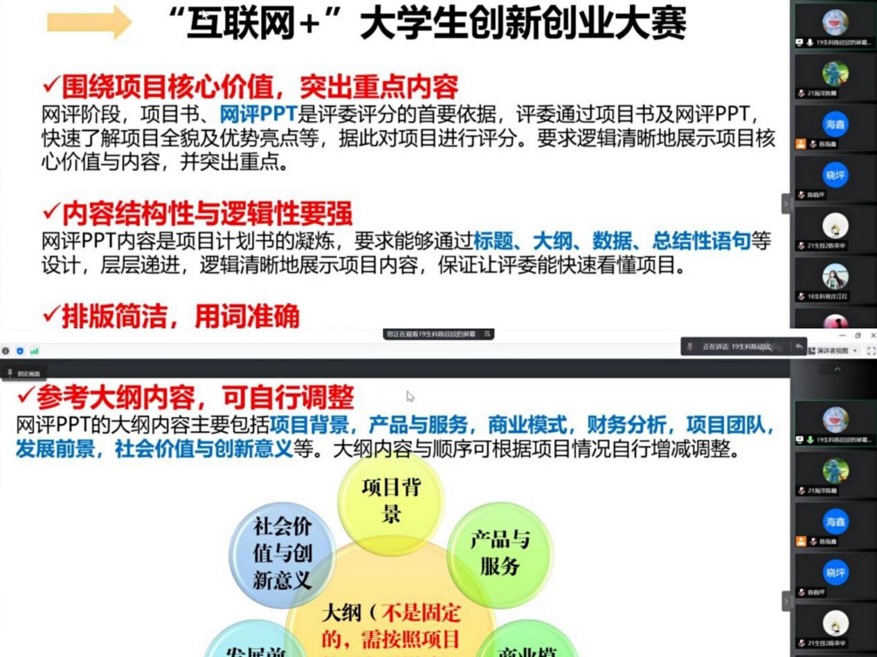 陈欣欣同学介绍了“三创”的赛事规模、目的、网上报名方式以及如何撰写项目策划书。她阐述项目计划书的书写包含以下要点:围绕项目核心价值,突出重点内容;内容结构性与逻辑性强;排版简洁,用词准确;内容可参考大纲,部分可自行调整。在比赛答辩环节中,关键点是项目陈述与评委提问。答辩时,流利、准确地表述,可以在有限时间内最大化展示团队项目内容,让评委耳目一新。