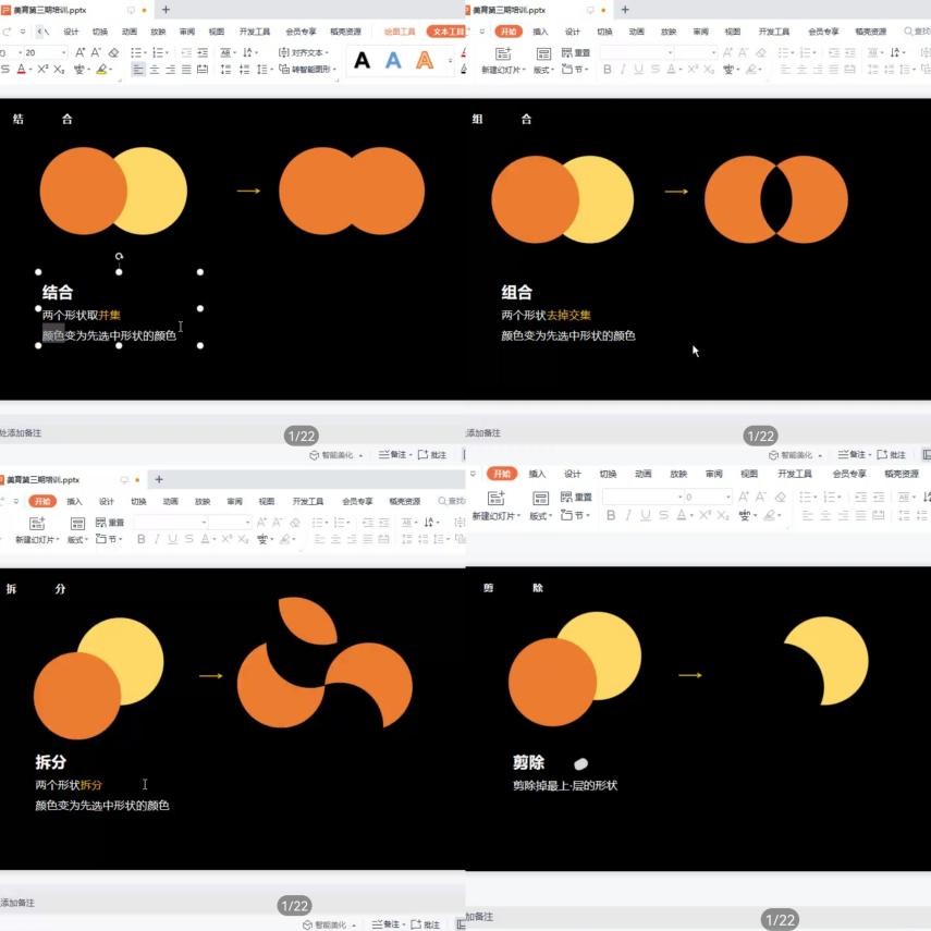 林慧老师从形状的种类、基本操作、作用、合并形状的基本操作及应用五个方面进行讲述。她介绍了PPT形状有158种,并阐释了其重要性。在形状的基本操作中,强调了“曲线”形状功能的多变性。并向同学们讲解了形状的作用,一是用形状表达流程,二是衬托文字,三是作为图标强力表达文字,四是区分不同区域,并详细介绍了制作方法。最后,林慧老师向同学们讲解了合并形状的基本操作及应用,拓展了同学们的设计思维。
