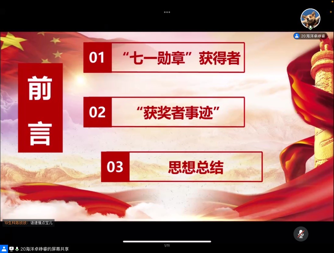为促进理想信念教育和爱国主义教育,进一步贯彻社会主义核心价值观,我院于2022年4月9日线上举办了第二期读书分享会,主题为“七一勋章”获奖者事迹分享。本次培训的主讲人为学术科技部的卓峥睿同学。