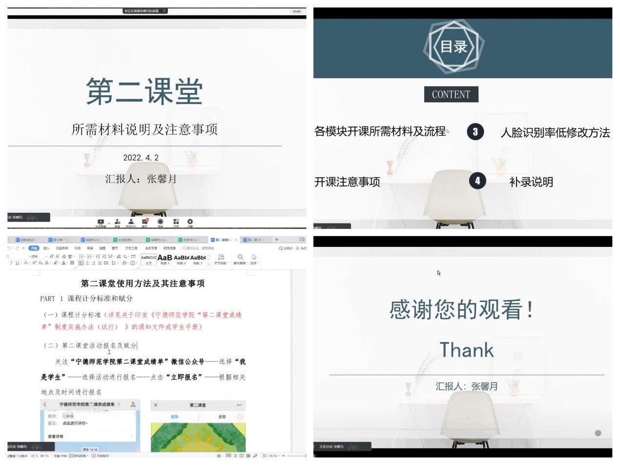 张馨月同学从各模块开课所需材料及流程、注意事项、人脸识别率低修改方法、补录说明四个方面详细介绍了第二课堂的开课;其次,她从课程计分标准和赋分、签到签退、课程补录三方面补充介绍了第二课堂的使用方法及注意事项;在最后环节,张馨月同学就大家提出的疑惑进行了全面的解答。