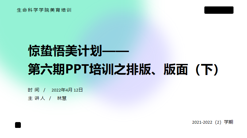 为进一步提高我院同学制作PPT能力,提升PPT排版、版面设计意识。我院于2022年4月12日线上举办了第六期美育培训PPT培训之排版、版面培训,主讲人为林慧老师。
