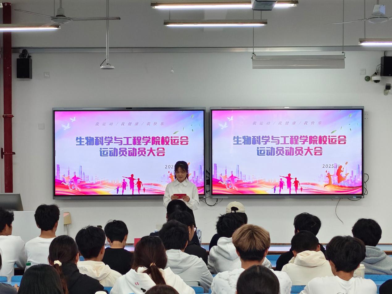为增强我院大学生的团队凝聚力与竞技体育精神,更好地在学院内形成积极投身赛事、顽强拼搏,奋勇争先的良好氛围。我院于2025年11月14日下午在CC201举办校运会运动员动员大会。参会人员包括生物科学与工程学院副院长杨克润、团委书记王永吉、辅导员林姗以及47名同学。