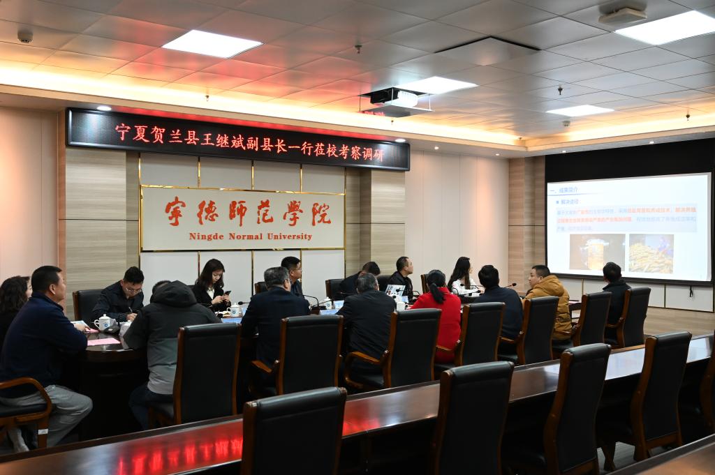 会前,校长魏远竹、副校长颜桂炀会见了来访人员。校长魏远竹指出:闽宁协作是习近平总书记在福建工作期间,亲自部署、亲自推动的重要战略决策,承载着习近平总书记的殷切期望和两地人民的深厚情缘,学校将大力支持成果在宁转化落地。副县长王继斌感谢宁德师范学院的技术帮扶支持和倾情付出,期望加快《大黄鱼低盐碱驯化养殖项目》在宁夏银川市贺兰县落实落地,带动贺兰县水产养殖产业发展,让闽宁协作结出更加丰硕的果实,续写新时代“山海情”。出席本次会议的还有我校特聘教授刘家富研究员、福建省闽东水产研究所高级工程师张艺、科研处处长张光英及我院党委书记张秋良、院长阮少江、海洋资源开发技术专业系主任韩坤煌、副教授黄伟卿。