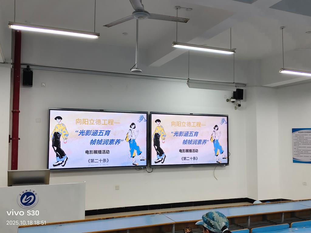 我院于10月18日晚在求实楼CC201举办“光影涵五育,帧帧润素养”第一期电影展播活动。播出了备受期待的法治题材影片《第二十条》。本次活动旨在通过影视艺术传播法治理念,丰富观众的精神文化生活,吸引了众多同学参与。