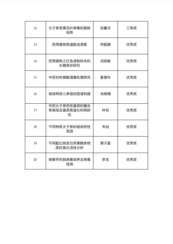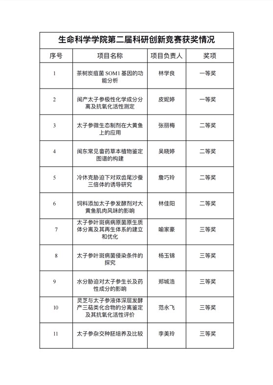 生命科学学院第二届大学生科研创新项目竞赛圆满落幕。经过了精彩的项目汇报和激烈的答辩,《茶树炭疽菌SOM1基因的功能分析》《闽产太子参极性化学成分分离及抗氧化活性测定》荣获一等奖(具体获奖情况详见获奖名单)。本次竞赛推进了我院科研平台“科研育人”模式,促进了我院创新教育改革个人才培养,提高了同学们的创新创业创造意识。
