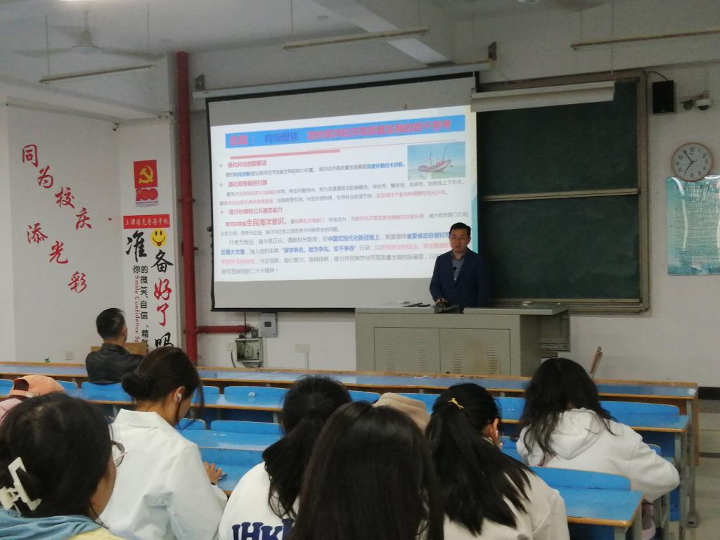 在讲座上,他从认识海洋,介绍海洋经济和如何建设海洋强国三个方面向同学们进行介绍。宋武林从询问同学们心中的海洋是什么样子的进行引入,向同学们讲解海洋的基本情况。同时由浅入深,向同学们介绍了海洋经济的基本情况和建设海洋强国的措施及原因,例如不断提高海洋开发能力,使海洋经济成为新的增长点;构建蓝色经济伙伴关系;坚决维护领土主权和海洋权益等。