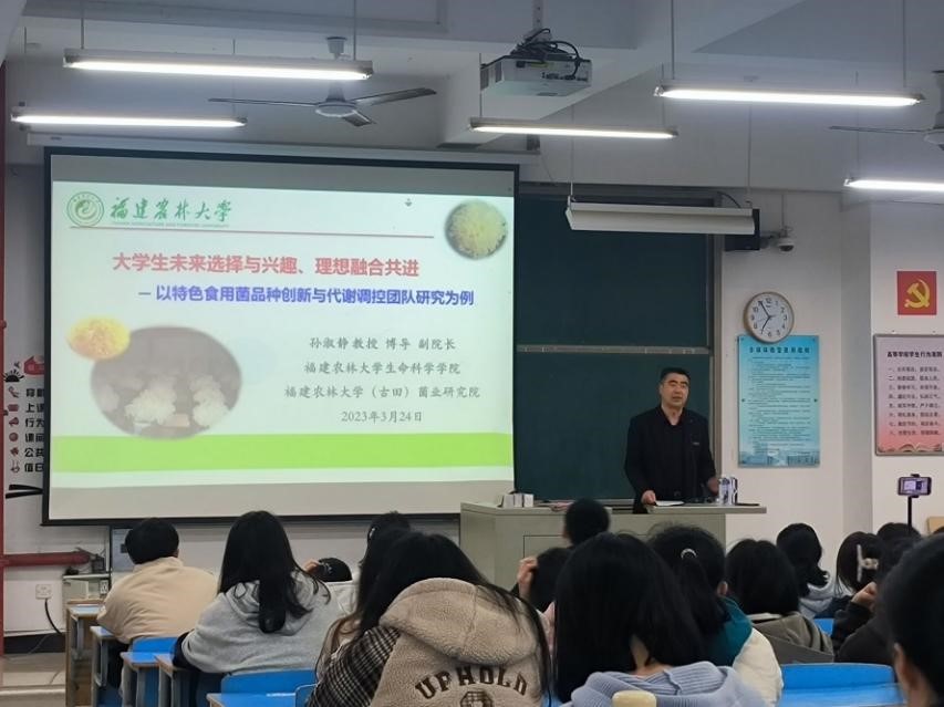 孙淑静教授首先介绍了福建农林大学生科院整体情况,随后以自己所在的课题组特色食用菌品种创新与代谢调控团队为例,引导同学们以培养学科兴趣为主,参与教师科研,在为企业解决行业难题的时候发掘科学问题,深入探索,个人发展与企业共成长,希望同学们在兴趣中学习,在学习中找到目标和理想。