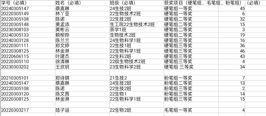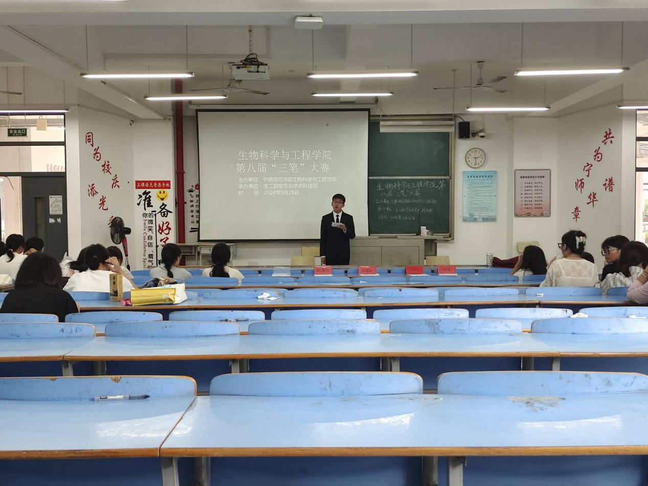 2024年9月28日,我院在求实楼举行第八届“三笔”大赛。此次大赛是我院深入贯彻习近平新时代中国特色社会主义思想,积极响应党的二十届三中全会关于教育强国建设战略部署的具体实践。本次大赛旨在提升我院学生的书法水平与文字表达能力,激发创新思维和艺术创作潜能,同时为学生树立良好的示范,助力师范生专业技能的成长,为未来的教育工作奠定坚实的基础。为了确保比赛的专业性和公正性,学院特别邀请了生物科学系的林雄平老师、林珊老师和刘凯良老师担任评委。