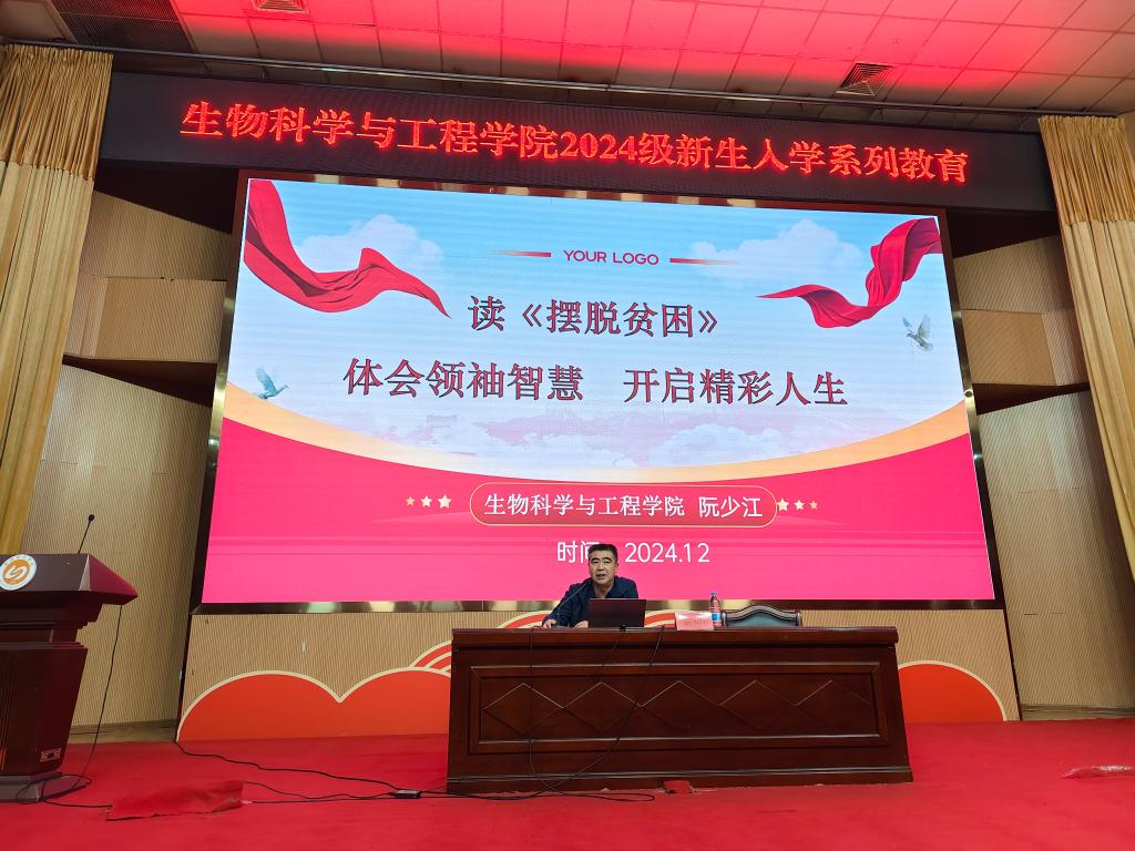 2024年12月3日下午,“读《摆脱贫困》体会领袖智慧,开启精彩人生”专题讲座在图书馆报告厅圆满举办。本次讲座主要面向我院2024级全体新生,由生物科学与工程学院阮少江党委书记担任主讲人。旨在通过研读领袖经典著作,引导同学们感悟领袖精神,激励大家为实现个人价值和社会进步贡献力量。