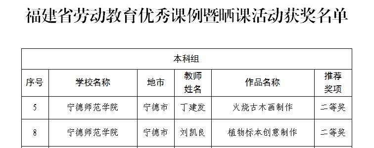 近日,福建省教育厅正式公布全省劳动教育优秀课例展示暨晒课活动评选结果,我院丁建发老师申报的《火烧古木画制作》与刘凯良申报的《植物标本创意制作》两门课例,从全省217堂优秀课例中脱颖而出,双双荣获二等奖。这一殊荣不仅是对两位教师教学创新能力的充分肯定,更是我院深化劳动教育改革、推进“五育并举”育人体系的重要成果。
