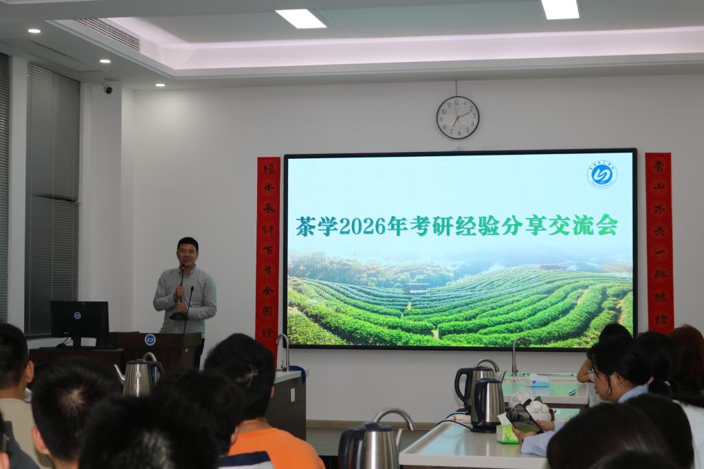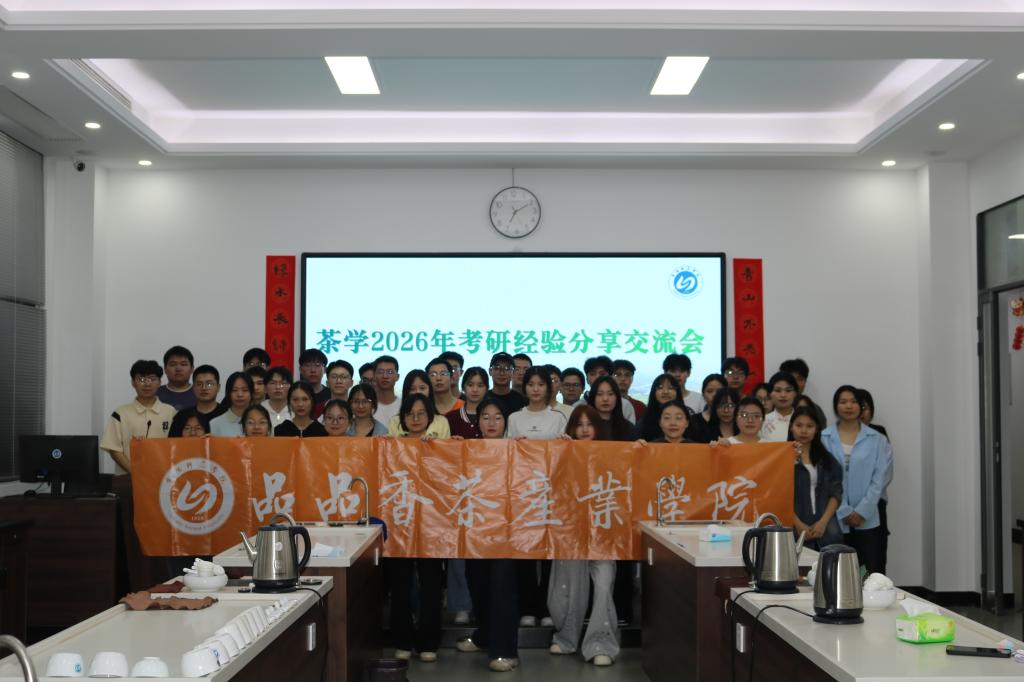 4月14日晚,由我院茶学系、品品香茶产业学院主办的2026届考研经验分享交流会在茶叶审评中心举行。本次活动由周子维老师主持,海洋学院副院长、2023级茶学班班主任郑世仲老师出席,茶学系60余名学生到场参与。