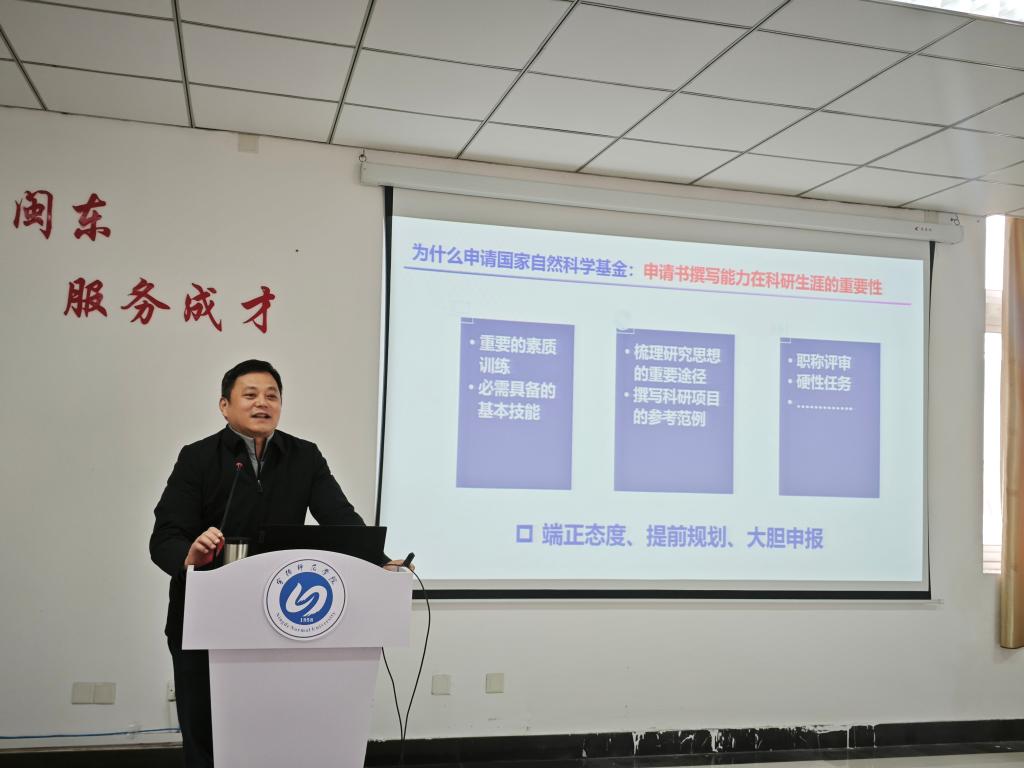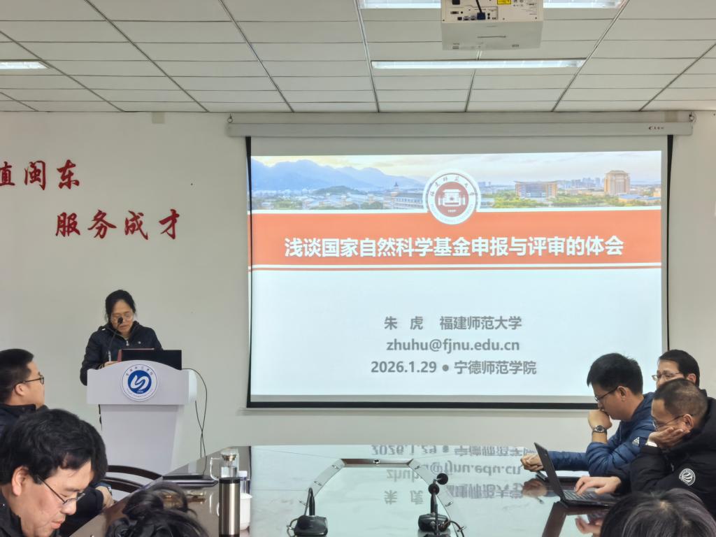 为切实提升教师科研申报能力,助力2026年度国家自然科学基金项目高质量申报,1月29日下午,国家自然科学基金申报专题辅导活动在求实楼CD201顺利举行。学院特邀福建师范大学化学与材料学院朱虎教授作专题辅导,学院全体教师及联合培养研究生50余人齐聚一堂,共研申报策略。