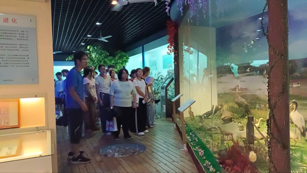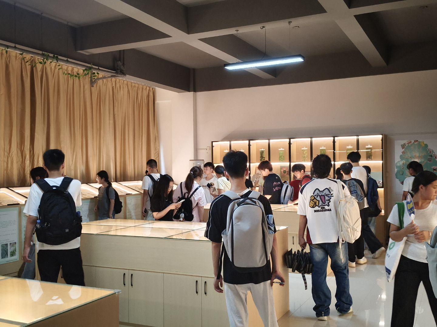 9 月 20 日,在自然坊工作人员的引导下,参观队伍依次走进哺乳动物、鸟类、昆虫及植物四大主题展区。哺乳动物展区内,威严的东北虎标本与灵巧的金丝猴标本形成鲜明对比,搭配模拟自然生境的布景设计,让参观者仿佛置身野外。移步植物标本区,参与者通过细致观察蜡叶标本和立体浸制标本,深入掌握不同科属植物的形态特征。参观过程中,工作人员还邀请师生通过显微镜观察蝴蝶翅膀的鳞片与植物表皮的微观结构。整个参观路线设计科学合理,全程既有系统性的知识讲解,又设置了互动体验环节,参观者在沉浸式体验中深化对生物多样性的认知,进一步提升生态环境保护意识。