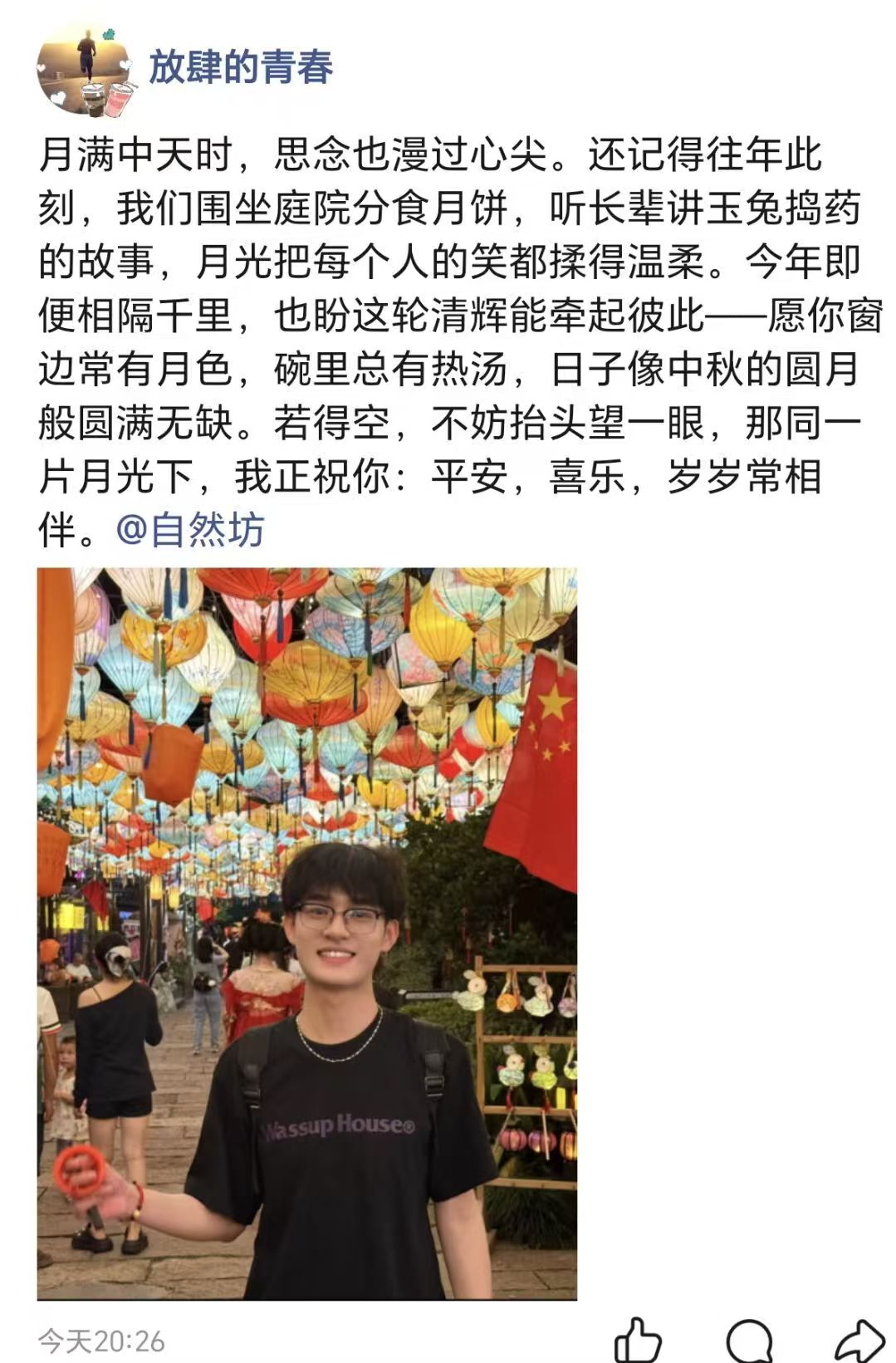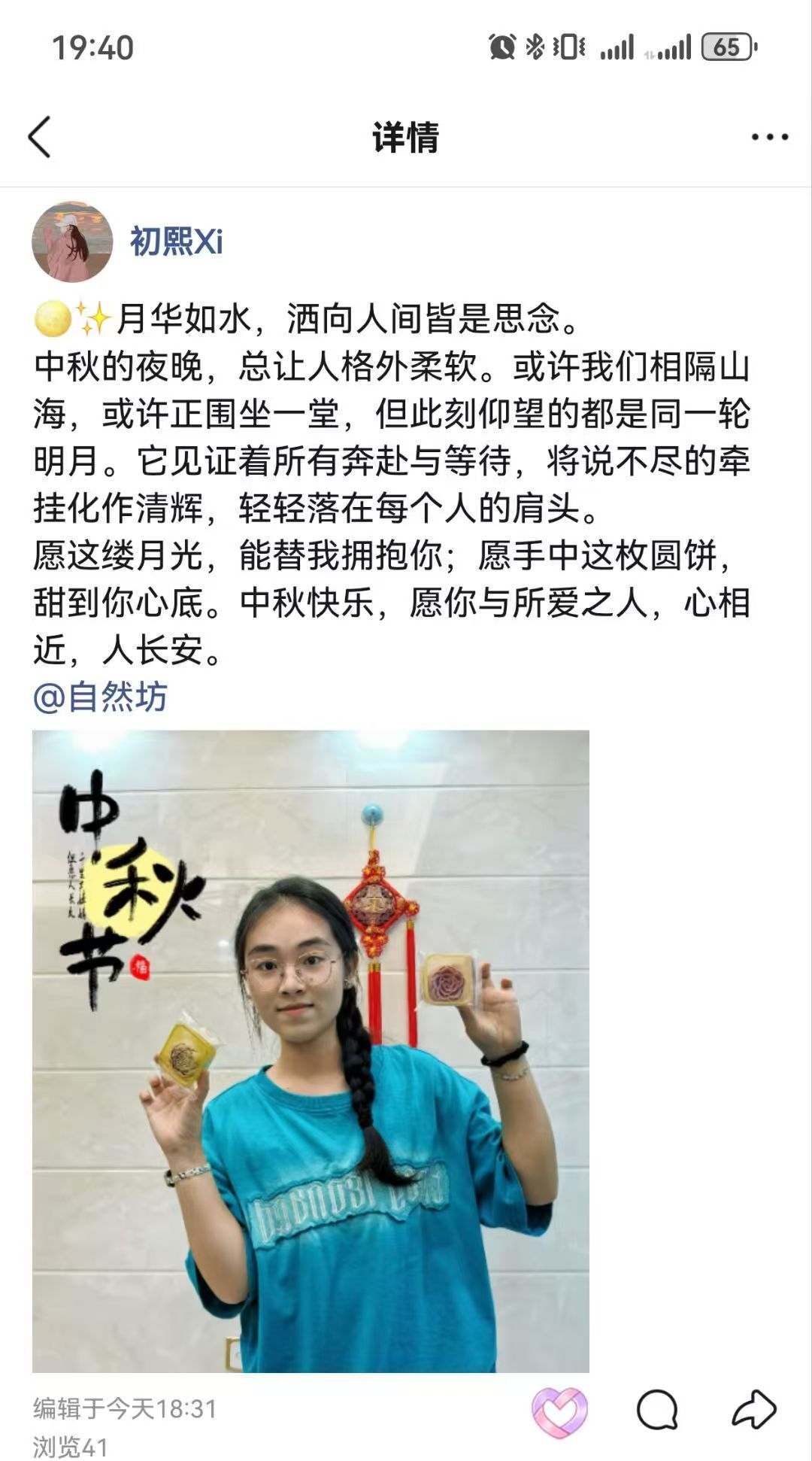 此次活动延续了自然坊在推动文化传承与校园文化建设方面的积极角色,以轻松有趣、贴近青年的方式,让传统节日焕发新的活力,为校园文化建设增添了一抹温暖而独特的中秋色彩,实现了中华优秀传统文化在青年群体中的创造性传承与传播,为同学们提供了一次难忘的文化体验。