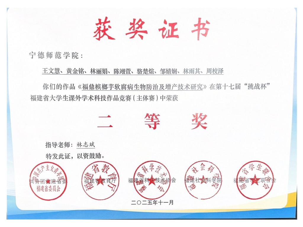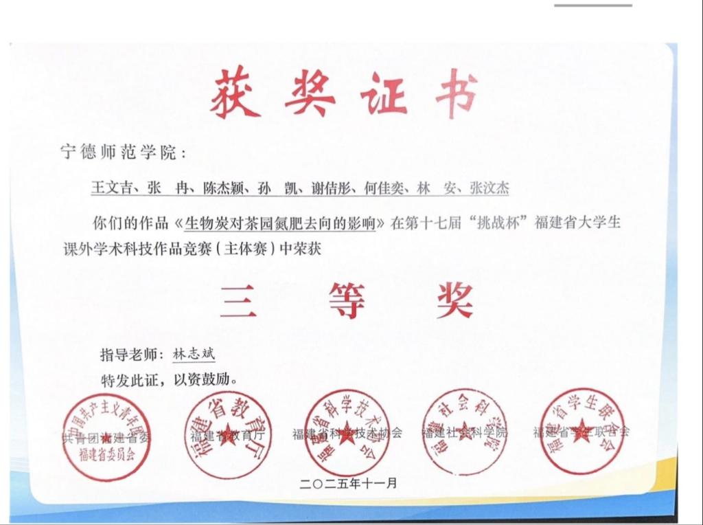 林志斌老师指导王文慧、黄金铭等8位同学完成的《福鼎槟榔芋软腐病生物防治及增产技术研究》项目,凭借严谨的实验设计与实用的研究成果,荣获省级二等奖;林志斌老师指导王文吉、张冉等6位同学的《生物炭对茶园氮肥去向的影响》项目,聚焦茶园生态与肥料利用研究,斩获省级三等奖。