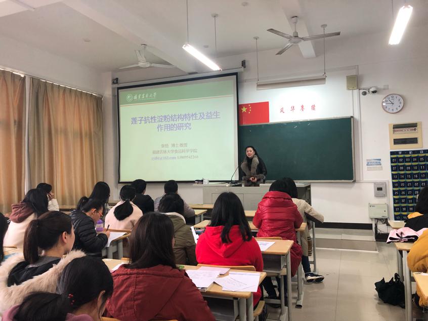 2019年1月4号上午10:30,我院于CC202开展《莲子抗性淀粉结构特性及益生作用的研究》讲座,本次讲座的主讲人是福建农林大学食品工程学院的张怡教授,出席本次讲座的有生科院的学生,以及陈美霞等三位老师。