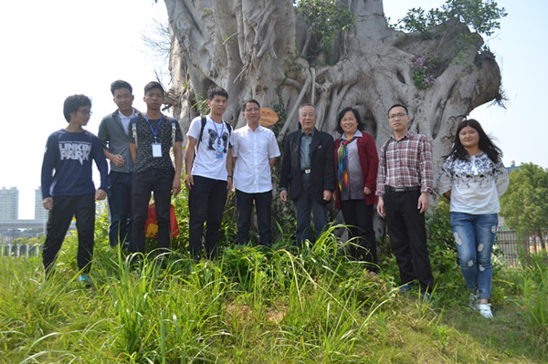 老师、同学们为校门口的第一棵大榕树挂牌后合影