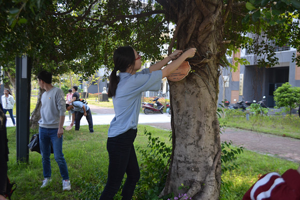 校资后处副处长朱昌富、系党总支书记陈爱平和闽东植物分类学专家陈勇老师,携手为校门口旁的第一棵大榕树挂牌,拉开本次“共享绿色校园”活动序幕。随后,生物系预备党员、自然坊协会成员以及系学生会成员也纷纷为校园各处树木挂牌。