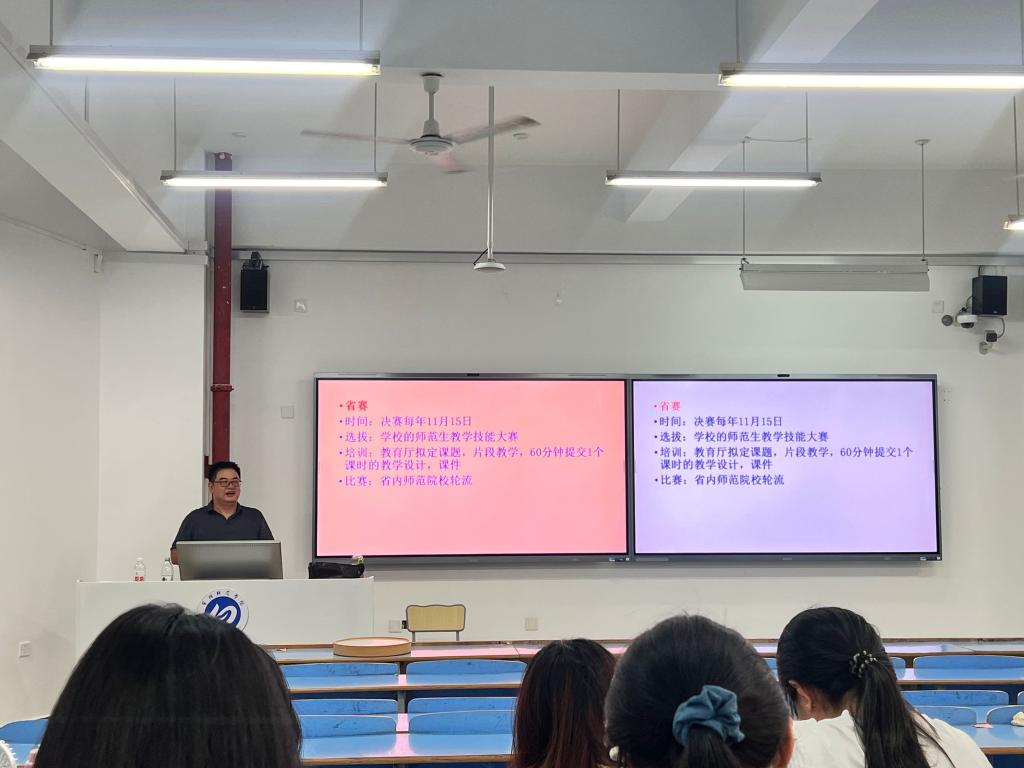 在“师范生教学技能竞赛及学科专业竞赛指导”讲座中,林雄平老师详细介绍了田家炳杯、师范生教学技能大赛等重要赛事,并展示了近年来学院学生在这些比赛中获得的奖状,激发了同学们的参赛热情。他指出,参加此类竞赛是提升教学能力、展现专业水平的重要途径。林老师为同学们讲解了备赛要点:了解比赛规则是参赛的基础,只有明确规则,才能有的放矢地准备;在教学设计方面,要注重创新和实用性,突出学生主体地位,合理运用教学方法和手段,提升教学效果。林老师鼓励同学们积极参与竞赛,以赛促学,不断提升自己的教学技能。