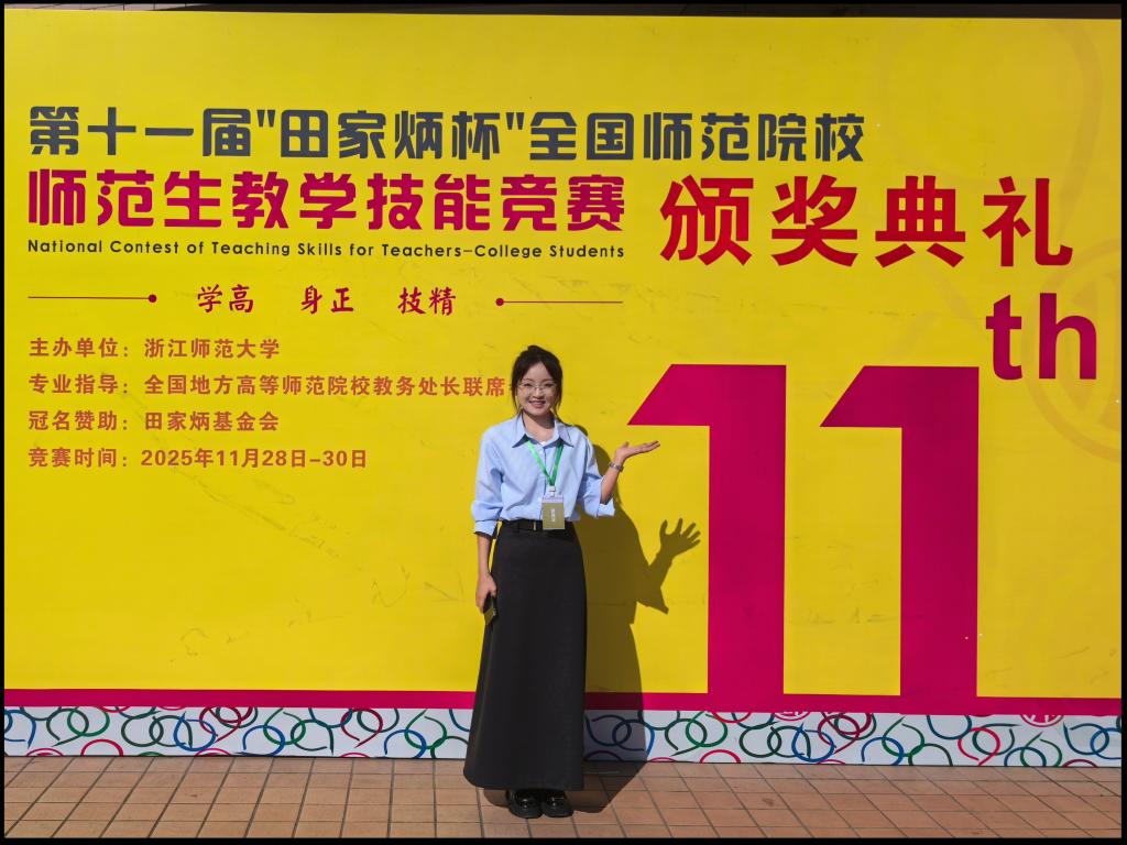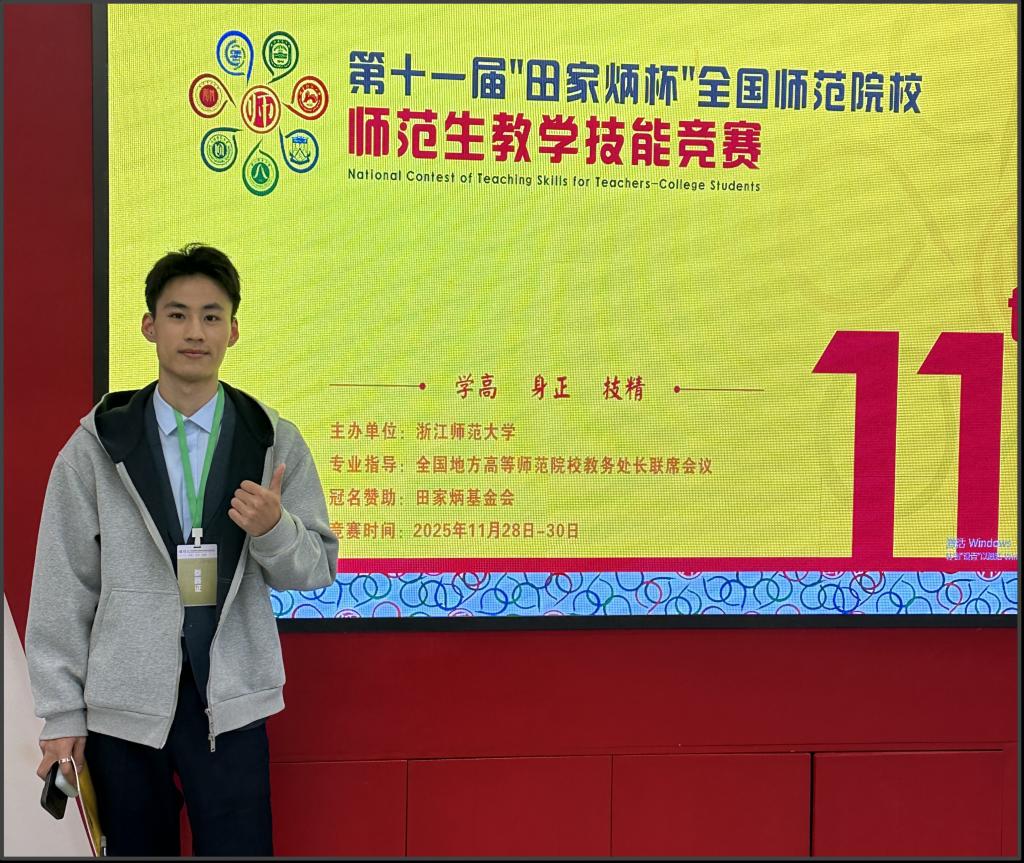 2025年11月30日,第十一届“田家炳杯”全国师范院校师范生教学技能竞赛在浙江师范大学圆满落幕。本届赛事吸引全国289所本科院校2345名师范生同台竞技,经初赛严格筛选,564名选手入围决赛。由林雄平老师指导的我院2022级本科生黄金铭、龙必姗两位同学,凭借精巧的教学设计、扎实的专业素养和灵动的课堂呈现,分别斩获生物科学组二等奖、初中科学组二等奖,其中初中科学组为我院首届参赛即获奖,充分展现了学院师范生的教学能力与新时代青年教师的青春风采。