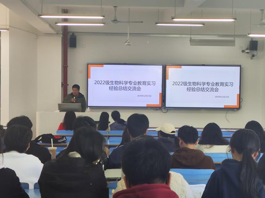 12月23日下午,学院组织召开2022级生物科学专业实习经验交流会。本次会议以“总结实习成果、促进经验互鉴”为主题,学院党委副书记杨克润、副院长陈美霞以及生物科学系全体教师出席会议。会议由生物科学系主任林雄平主持,11支实习小队依次作了汇报交流。