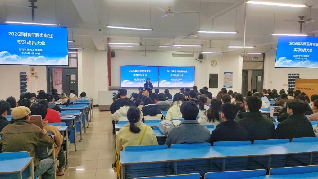 为协助我院非师范专业学生完成实习工作,我院于2026年1月20号下午在CC201进行2026届非师范类专业实习动员大会,本次大会特邀副院长杨克润、副院长陈美霞、教科办主任周银珠、学工办主任王永吉、生物技术系主任张承康、茶学系主任周子维以及各位实习指导老师,22级生物技术专业与茶学专业的学生参加。