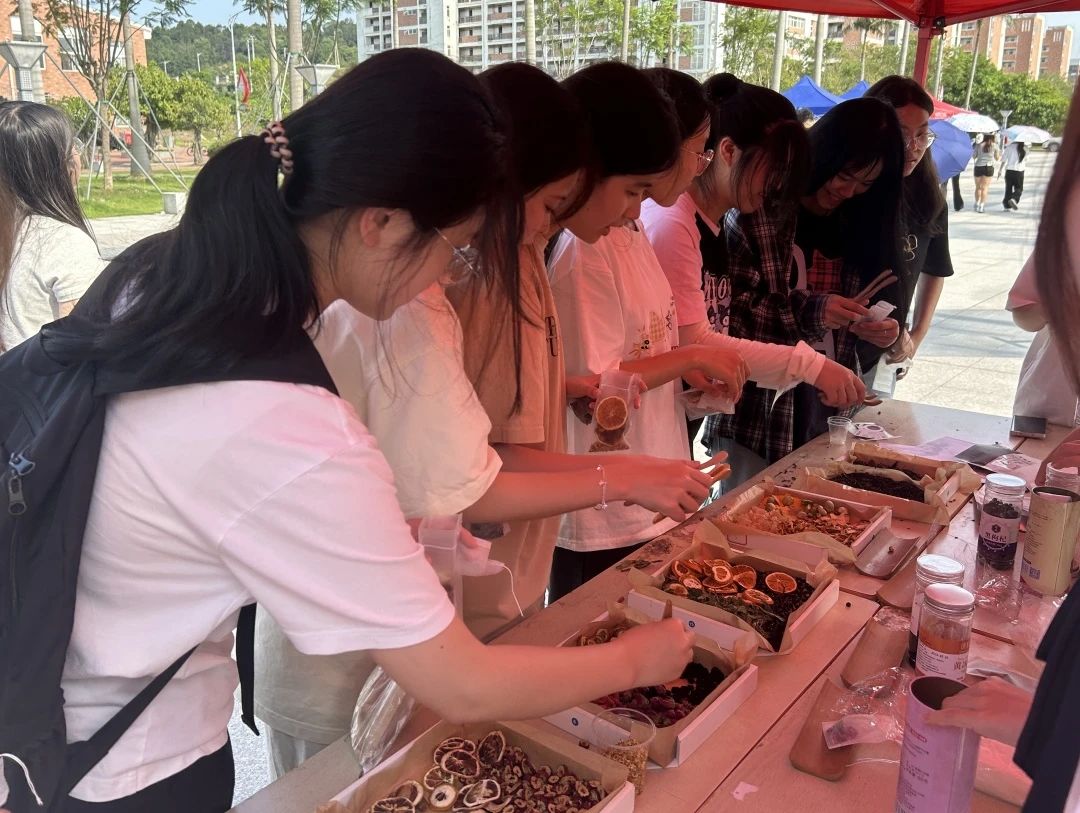 活动首日,“茶沁心宁”体验活动在花海广场启幕。活动设置专业斗茶品鉴、标准化秤茶操作、创意花果茶拼配三大实践模块。在斗茶环节,学生通过观汤色、闻香气、品滋味,精准识别茶叶品种;秤茶量环节依托专业器具,考验学生的实操精准度;花果茶拼配则融合传统茶韵与现代审美,现场创新氛围浓厚。